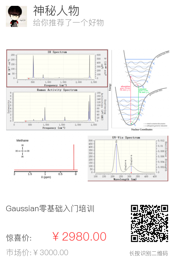 实操使用Gaussian计算红外光谱、拉曼光谱、紫外可见光谱、荧光光谱、磷光光谱、核磁共振谱的方法。