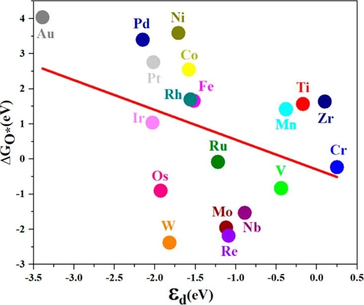 主要是Pt1 /PMA、Ru1/PMA、V1/PMA和Ti1 /PMA通过Volmer-Heyrovsky途径实现了近乎理想的ΔGH*值(ΔGH* = 0),从而实现了对HER的良好催化性能。Co1/PMA (0.45 V)和Pt1/PMA (0.49 V) 可以作为 OER的活性和选择性催化剂,其过电位与MoC2、IrO2和RuO2相当。
