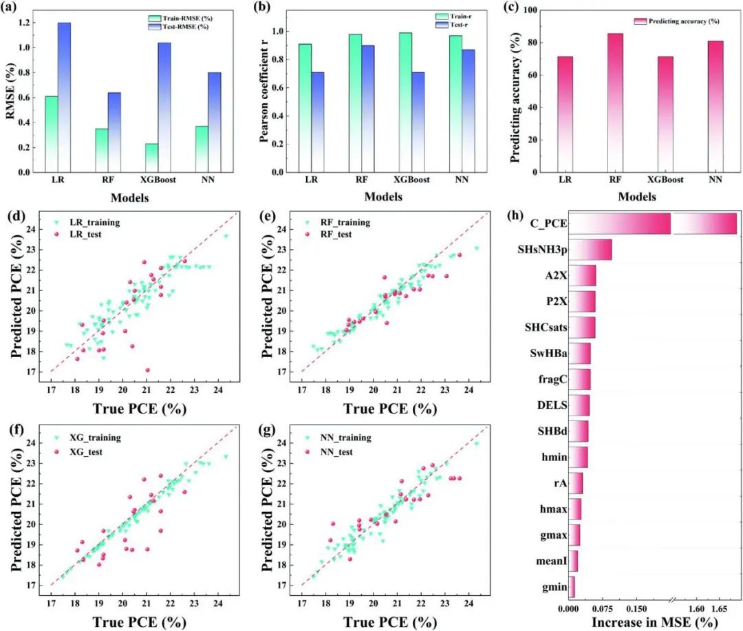 在此,北京交通大学徐征研究员、宋丹丹副教授及福建师范大学卫东等人以PSC 的钙钛矿/空穴传输层(HTL)界面为例,采用机器学习方法在原子水平上映射PCE和界面钝化材料之间的相关性,从而实现智能材料筛选。首先,作者构建了包括大约100种用于钙钛矿/空穴传输层界面的界面材料的数据集。然后,在进行机器学习之前提取不同的特征,包括从界面材料、钙钛矿和标准器件性能中提取的特征。接下来,采用线性回归(LR)、随机森林(RF)、极端梯度提升(XGBoost)、神经网络(NN)4种模型预测基于100多种界面材料的器件效率。模型评估表明,RF模型最好地预测了PCE,均方根误差为0.7%。最后,作者使用DFT计算来模拟钙钛矿表面和界面材料之间的相互作用以解释这些特征在确定器件PCE中的重要性。