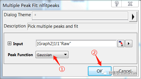 于是,会弹出图3所示的对话框,选择峰拟合函数Peak Function为Gaussian,然后点击“OK”。