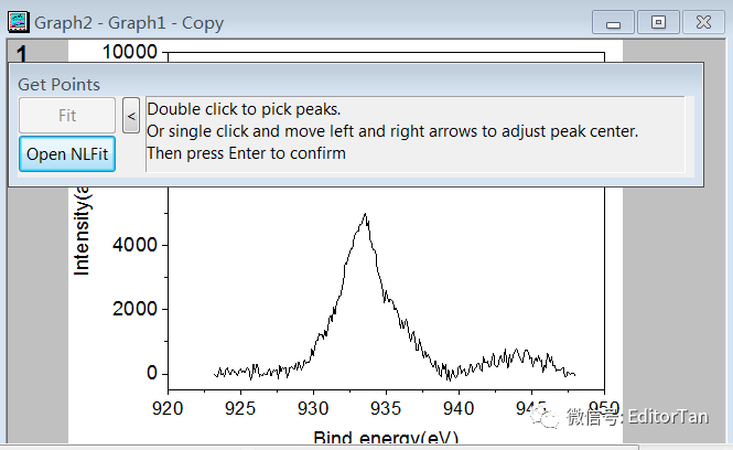 弹出一条提示框:双击拾取峰位置,或者单击并敲击←、→方向键精确调节峰中心位置,最后按回车或点击“Open NLFit”。