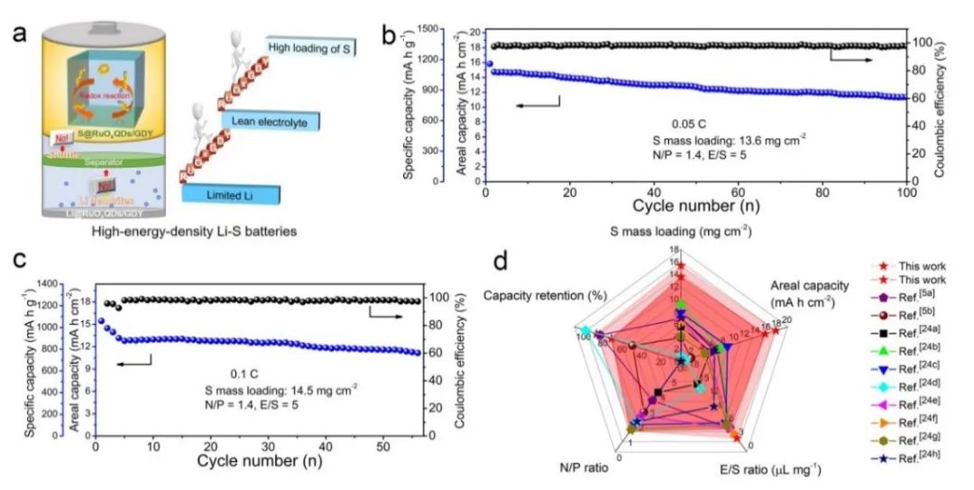 RuOxQDs/GDY与Li离子的强亲和力和快速的Li离子扩散也使其成为超稳定的Li金属负极,因此S@RuOxQDs/GDY正极在恶劣条件下表现出优异的循环性能,而Li@RuOxQDs/GDY阳极则显示出超过8800h的超长循环寿命,且无锂枝晶生长。结果显示,采用S@RuOxQDs/GDY正极和Li@RuOxQDs/GDY负极的Li-S全电池在低正负极容量比(N/P=1.4)、贫电解质(E/S=3μL/mg)和高S质量负载(15.4mg/cm2)的实际条件下,可提供17.8mAh/cm2的惊人面容量和良好的循环稳定性。