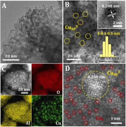 研究人员采用溶胶-凝胶法合成了具有Cu2+单原子(Cu12+)靶结构的催化剂前驱体(Cu12+/Al2O3),Cu12+物质通过还原转化为Cu1+和CuNP0位点。机理研究表明,Cu1+位点不仅强烈吸附CO并充当CO“池”以增加CuNP0位点周围的CO浓度,而且抑制CO在CuNP0上的竞争吸附,从而显着提高WGSR性能。