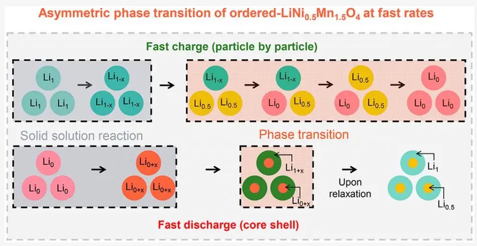 在减少锂离子电池中钴等稀有元素的背景下,尖晶石结构的有序 LiNi0.5Mn1.5O4 (o-LNMO)重新引起了人们的兴趣。o-LNMO以低倍率经历两个两相反应。然而,尚不清楚这种现象是否也适用于高倍率。