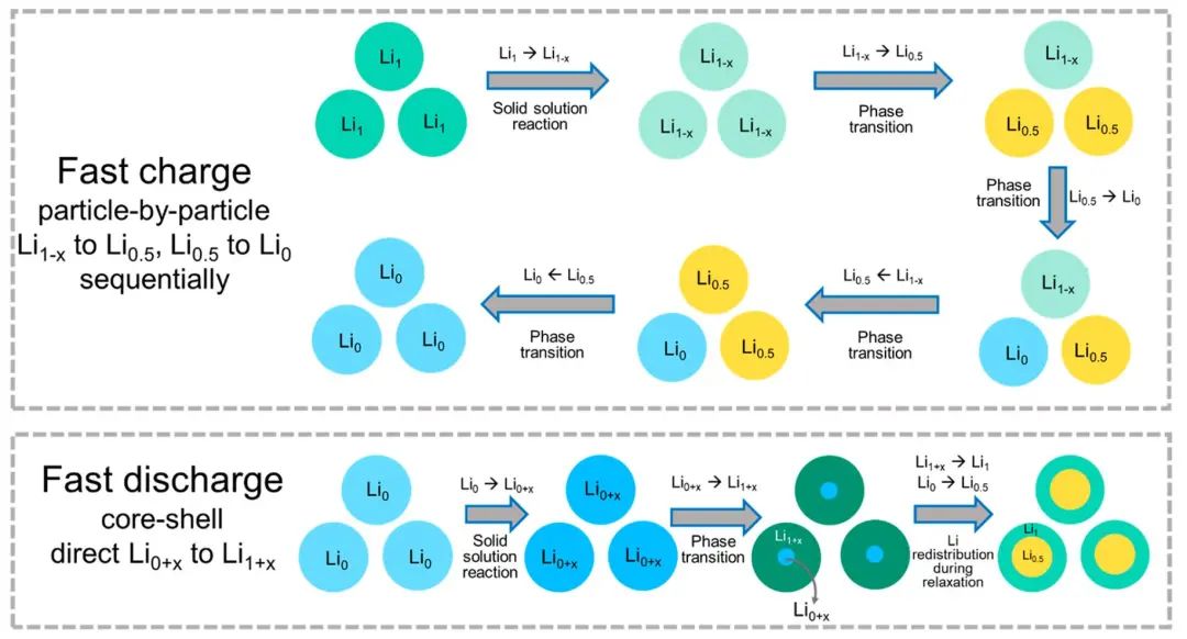 在快速放电开始时,Li0相发生轻微的锂化,形成Li0+x相,也发生固溶型反应。粒子的外层绕开中间的Li0.5直接从Li0+x转变为Li1相。在弛豫过程中,锂在粒子内重新分布导致Li1+x向Li1和Li0.5+x向Li0.5相转变。这些结果表明,Li0+x到Li1+x跃迁的能量势垒可能相当小,从而允许大多数粒子在局部交换电流变化的情况下经历这样的跃迁。