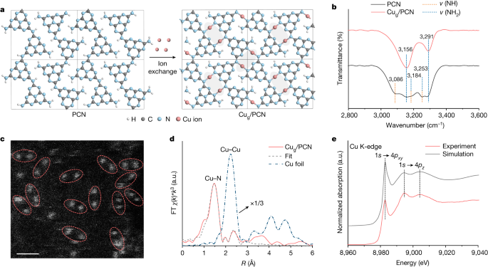 研究者利用PCN中N-H官能团作为金属配位位的丰富和周期性存在,设计了一种逐步离子交换和配体去除策略来合成低配位双金属原子(图1a)。引入时,Cu单原子取代了H原子,PCN的N-H基团相关振动带强度几乎完全降低(图1b)证实了这一点,并被相反的N原子进一步稳定。