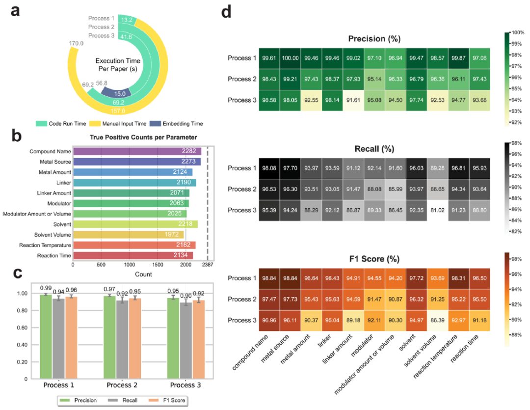 通过首先评估每个进程的执行时间消耗来开始性能分析(图5a)。如前所述,进程1中的ChatGPT助手专门接受预先选择的实验部分进行总结。因此,流程1需要人工干预,以识别和提取论文中的合成部分。在本研究中,228篇论文的完整选择过程持续了12小时,平均每篇论文约2.5分钟。这段时间必须被认为是进程1执行的必要时间。