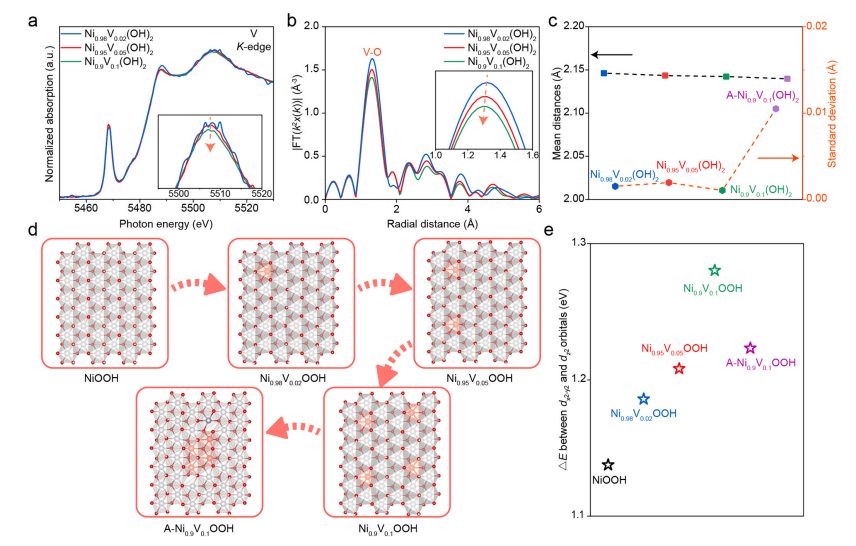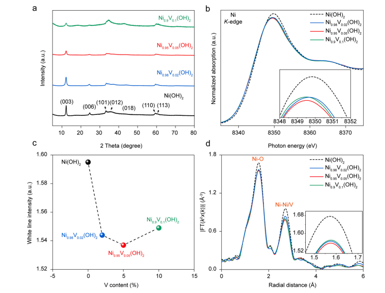 X射线衍射数表明钒成功的掺杂到了氢氧化镍晶格中,同步辐射表征数据显示NiO6八面体畸变程度随着钒含量的增加先增大再减小。