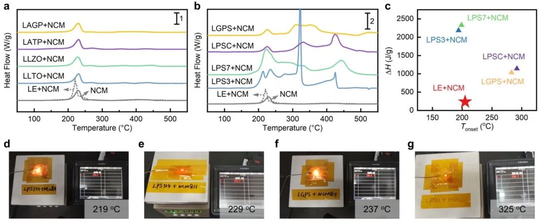 在气固反应的驱动下,玻璃陶瓷SE在约200℃时被NCM正极释放的O2氧化,产生大量热量和有毒的SO2气体。相反,结晶硫化物SE在200℃时对晶格O2保持稳定,不产生SO2,在300℃时与NCM正极的分解产物(过渡金属氧化物等)发生固-固反应。