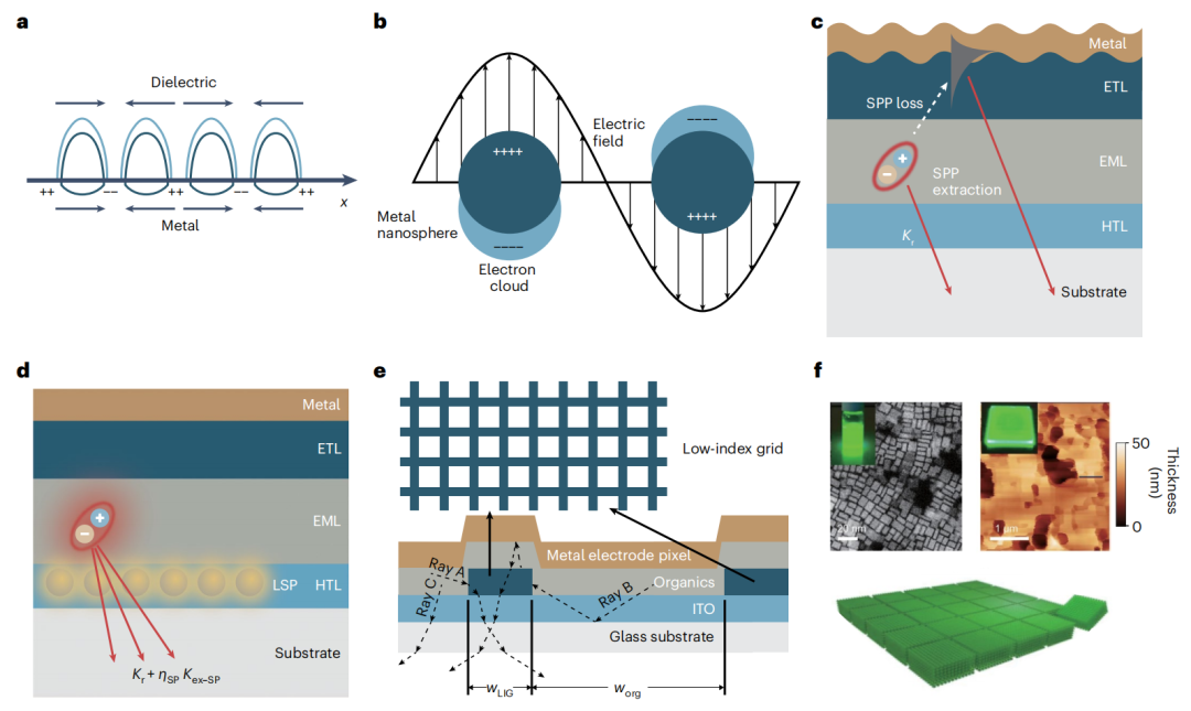研究显示,金属卤化物钙钛矿发光二极管(PeLEDs)已经超过了平面有机LED(OLED)类器件结构的20%的外部量子效率(EQE)极限,一些高性能PeLED的内部量子效率(IQE)已经接近100%。然而,光的非理想耦合导致大约80%的光子仍然被困在器件堆叠中,并最终通过一系列有损通道损失能量。