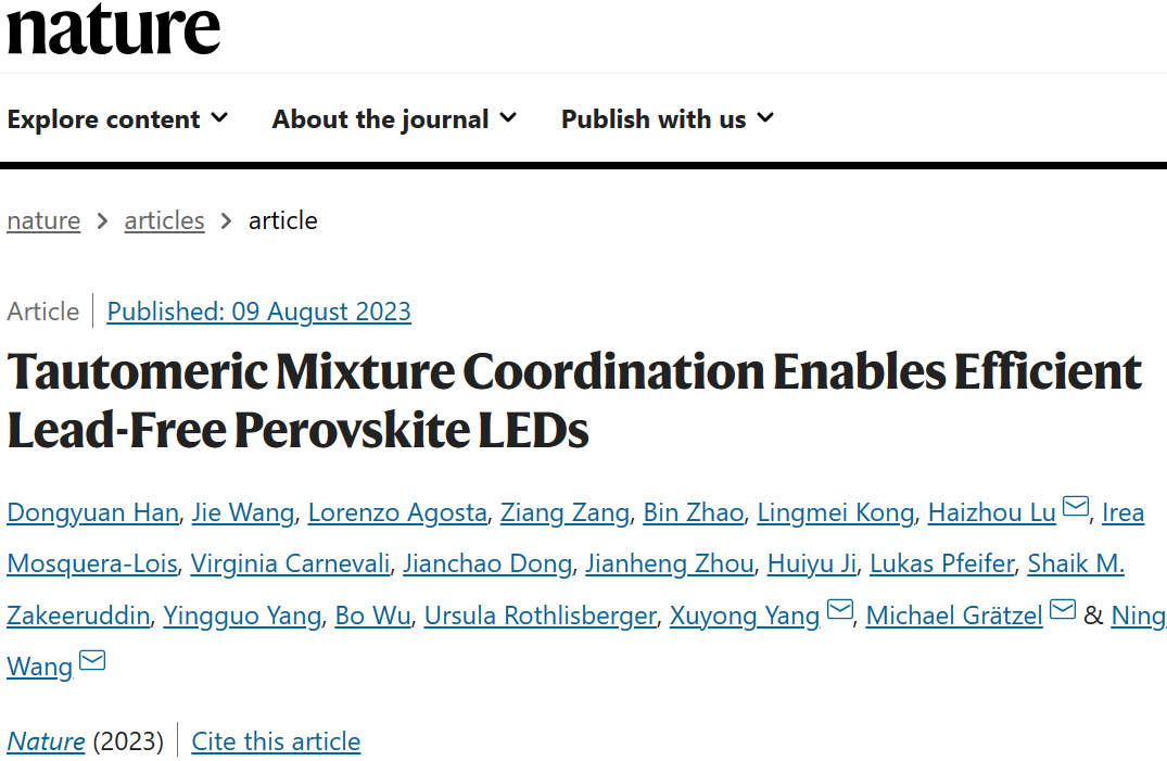 相关论文以题为“Tautomeric Mixture Coordination Enables Efficient Lead-Free Perovskite LEDs”于2023年08月09日发表在Nature上。