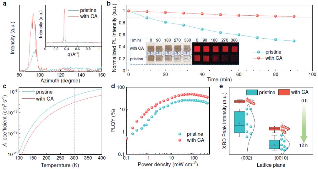 综上所述,将CA集成到二维TEA2SnI4中突破了目前无铅ped的性能瓶颈,使得研究者能够实现超过20%的EQE。CA的多功能特性导致形成取向良好且高度稳定的互变异构体CA配合物,使其与Sn(II)具有强的化学配位,有利于Sn钙钛矿薄膜的晶体取向和货架稳定性,从而改善辐射复合。