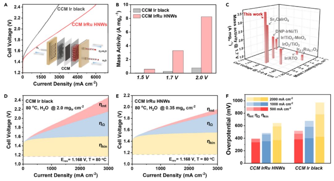 为了证明本文设计的电解水HNWs结构CL概念的实用性,作者以IrRu HNWs作为OER的阳极催化剂,商业化Pt/C作为析氢反应(HER)的阴极催化剂,以及质子交换膜构建了一个PEMWE电解槽(图4A)。与此同时,在1.5到2.0 V的宽电压范围内,CCM IrRu HNWs的质量活性仍然比比较商业化的Ir高一个数量级(图4B),这代表了所报道的最先进的催化剂中最好的性能之一(图4C),这得益于IrRu HNWs明显提高的贵金属利用率和较高的内在OER活性为了进一步阐明CCM IrRu HNWs活性的增强,作者使用过电位分析来区分动力学、欧姆和质量输运电位损失,然后评估了对极化曲线的各种贡献进行了去卷积(图4D-4F)。结果显示,随着电流密度的增加,CCM IrRu HNWs 展现出的34 mV动态过电位始,且终低于Ir,表明其较高的OER动力学。