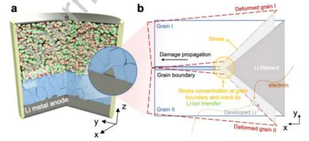 锂金属固态电池已成为满足人们对安全高效能源设备不断提高的要求的一种有竞争力的选择。然而,由于锂(Li)丝的发展导致固态电解质(SSE)失效,阻碍了它的广泛应用。根据晶粒大小和边界强度不同的多晶陶瓷固态电解质的性质,应用了与电化学动力学相耦合的构成方程来描绘锂丝发展所引起的损伤和相应的解体。