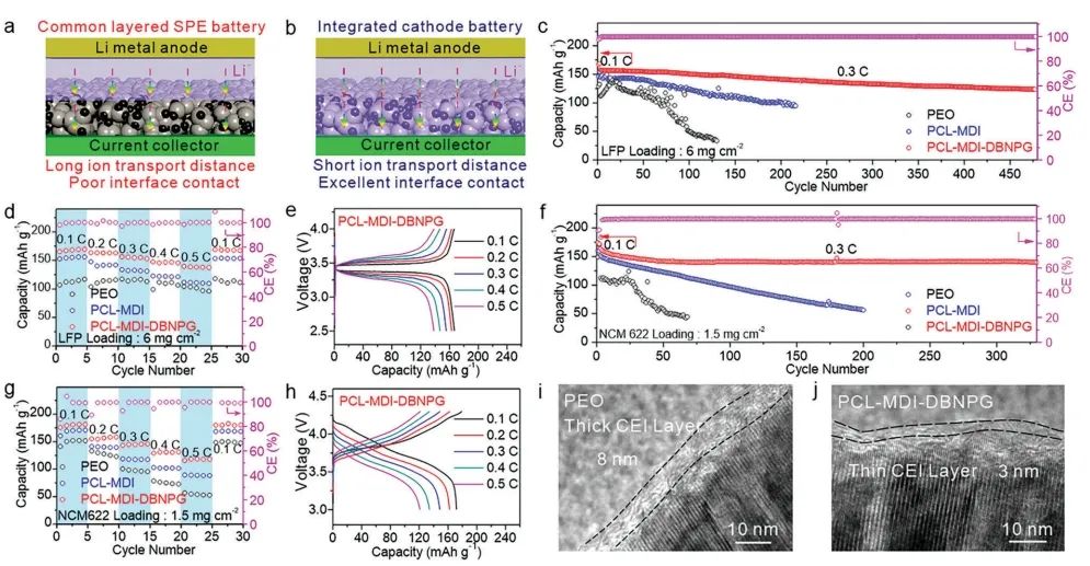 更重要的是,采用PCL-MDI-DBNPG/LiTFSI电解质和集成LiNi0.6Co0.2Mn0.2O2阴极的组装电池在0.3C下循环330次后可提供142.1 mAh g-1,容量保持率为85.2%。因此,该工作制备的SPE为制造高能量密度和安全的SSLMBs的提供了新的方向。