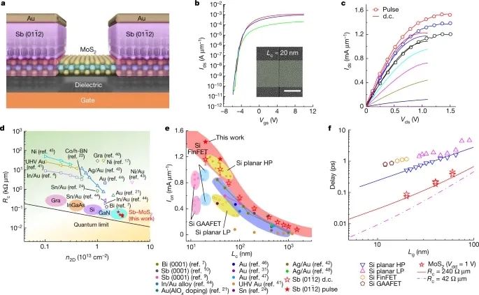 除了n型MoS2外,研究者还在双极性二硒化钨(WSe2)器件中展示了低Rc,这表明Sb可能是超越Si的基于TMD的电子产品的通用接触技术。