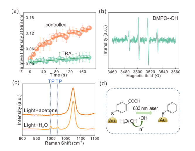 表面等离激元 (SPs) 衰变产生的热载流子具有极高的能量,可以诱导化学键的断裂或形成,驱动界面的催化反应。现有研究虽然观察到了此类现象,但缺乏一般性的理论解释。例如,Ag表面趋向于生成还原性的热电子,这无法解释Ag诱导的氧化反应;另外多个课题组发现了催化效率在非耦合激光下的显著提升,由于缺乏理论支撑,这种现象经常被归咎于纳米颗粒的聚合效应。本文中,作者以巯基苯甲酸(PMBA)的脱羧反应为例,探索了SPs诱导催化中的氧化机制。研究结果表明,无论是Au还是Ag体系,该反应都是由活性氧物种(ROS)而非热空穴驱动。本文进一步确认了SPs诱导ROS的产生机制与选择性调控,并基于能级理论给出了背后的机制。研究成果为选择性地生成ROS提供了理论与实验支撑,并为SPs诱导催化的理解与调控提供了理论基础。