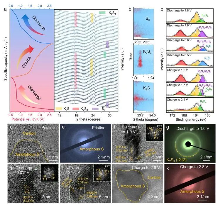 钾-硫(K-S)电池具有高能量密度(1023 Wh kg-1)、高元素丰度(K和S)、环保和低成本的优点,受到大规模储能的关注。然而,K-S电池的发展受到与硫的体积膨胀和电子绝缘性质、多硫化钾的穿梭效应以及动力学缓慢相关的挑战。其中,K-S电池具有明确的正极电化学过程,包括液相和固相过程,固相K2S3/K2S2转化为K2S工艺的容量达到理论容量的60%以上。