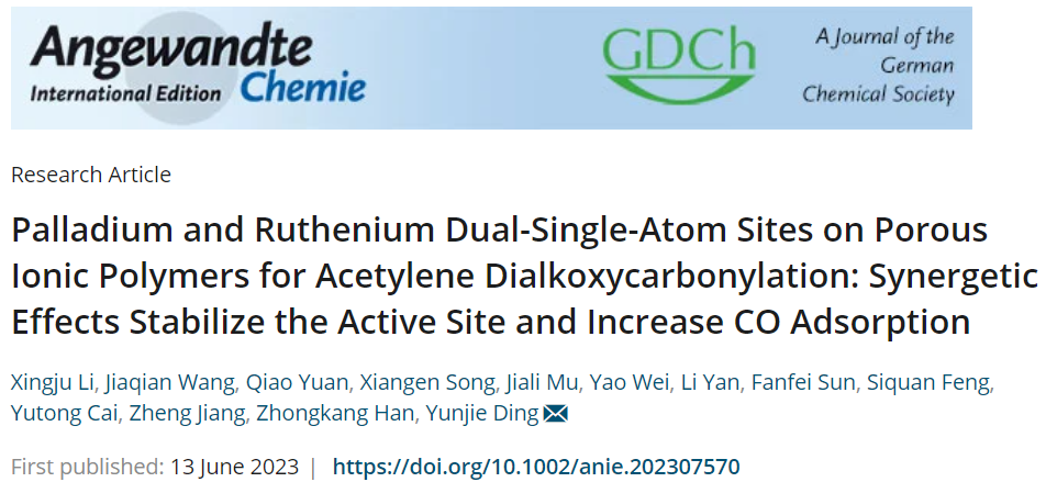 Palladium and Ruthenium Dual-Single-Atom Sites on Porous Ionic Polymers for Acetylene Dialkoxycarbonylation: Synergetic Effects Stabilize the Active Site and Increase CO Adsorption. Angew. Chem. Int. Ed., 2023, DOI: https://doi.org/10.1002/anie.202307570.