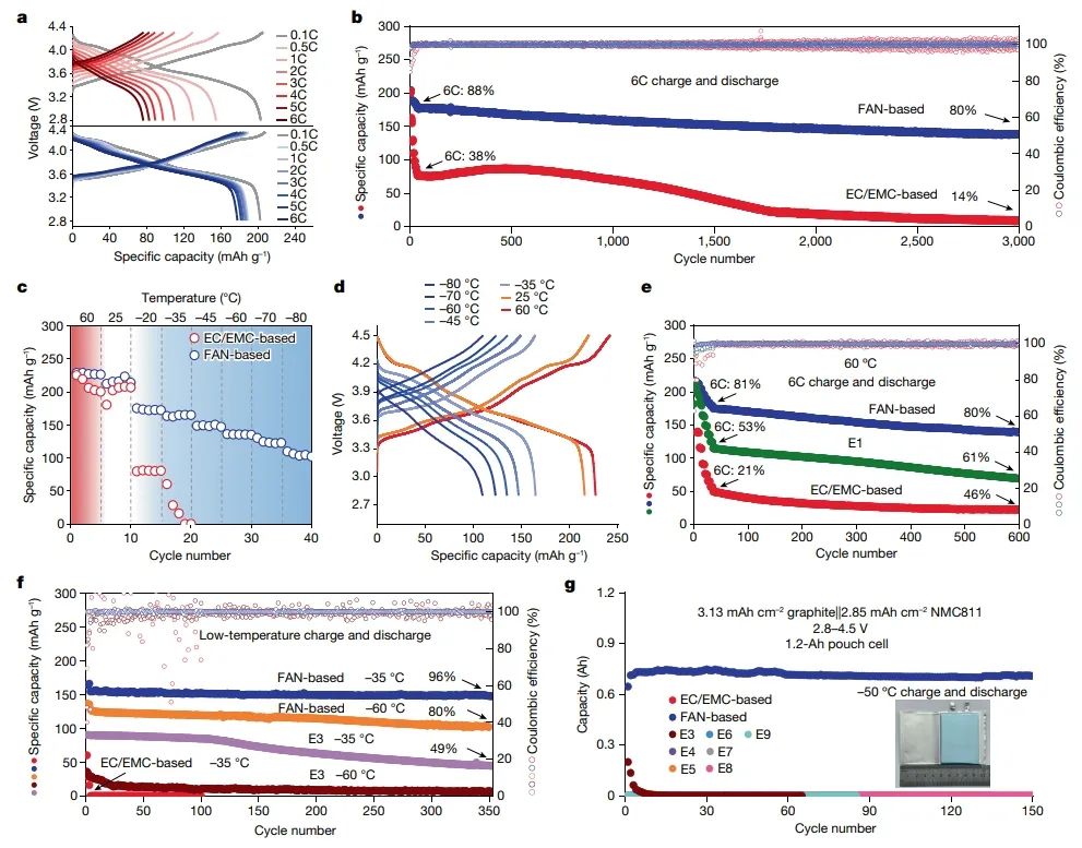 基于此,作者设计出一种新型电解液[1.3M双氟磺酰亚胺锂盐(LiFSI)/氟乙腈(FAN)],同时实现宽温高离子电导率(25°C:40.3 mS/cm,-70°C:11.9 mS/cm)并生成LiF-LixN-rich稳定界面。结果显示,该电解液使得石墨||NMC811电池在6C高倍率下实现超3000圈的稳定循环,以及1.2 Ah 石墨||NMC811软包电池在-50°C下可逆充放电超150圈无明显容量衰减。