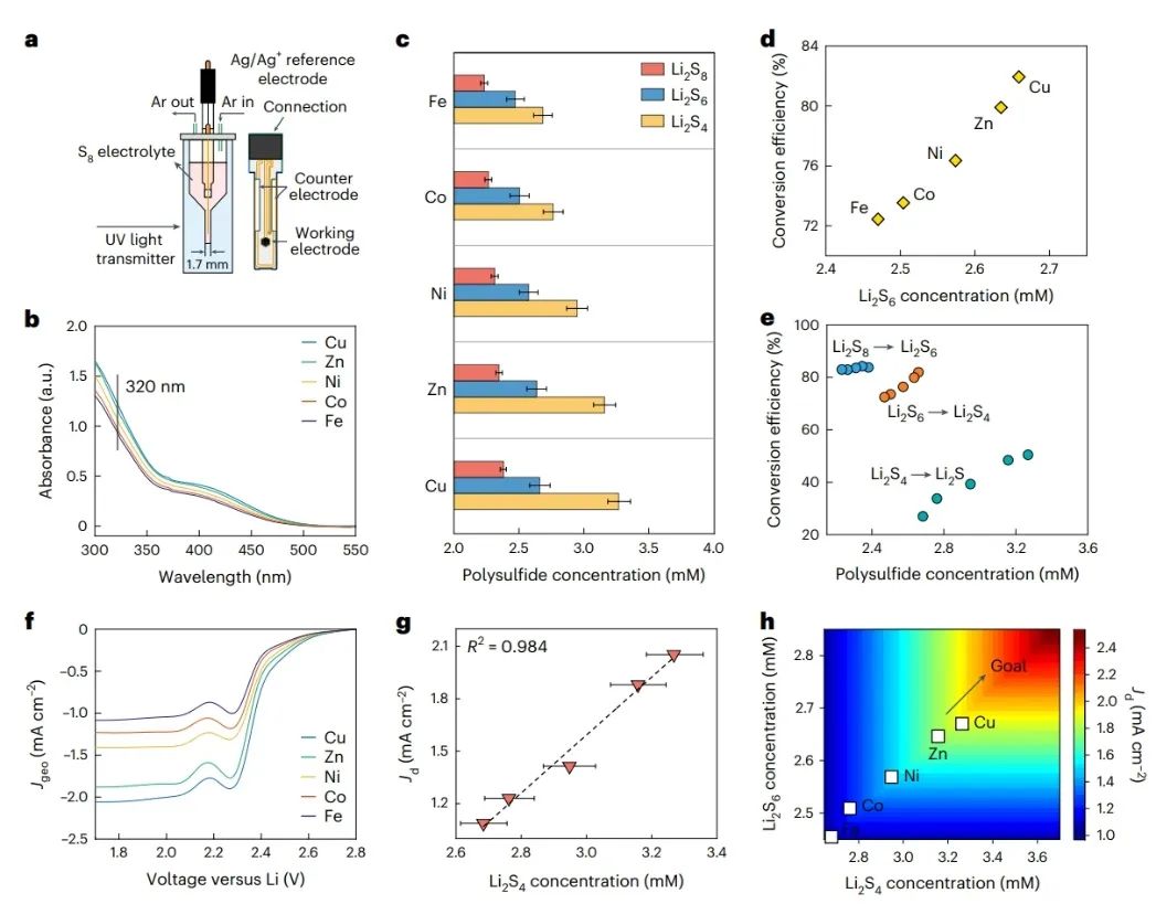在此,阿德莱德大学乔世璋团队以一系列石墨烯基过渡金属催化剂为例(Fe、Co、Ni、Cu、Zn),依据勒夏特列原理首次提出了SRR反应的动力学趋势。研究发现:SRR的动力学随着催化剂表面多硫化锂浓度的增加而提升,动力学电流(J)和多硫化锂浓度(C)之间对数比值的一阶导数(dlogJ / dlogC)与充放电速率(V)呈现线性关系。通过同步辐射X射线吸收光谱测量和分子轨道理论计算,研究证明了催化剂的反键轨道占据率决定了多硫化物的浓度。