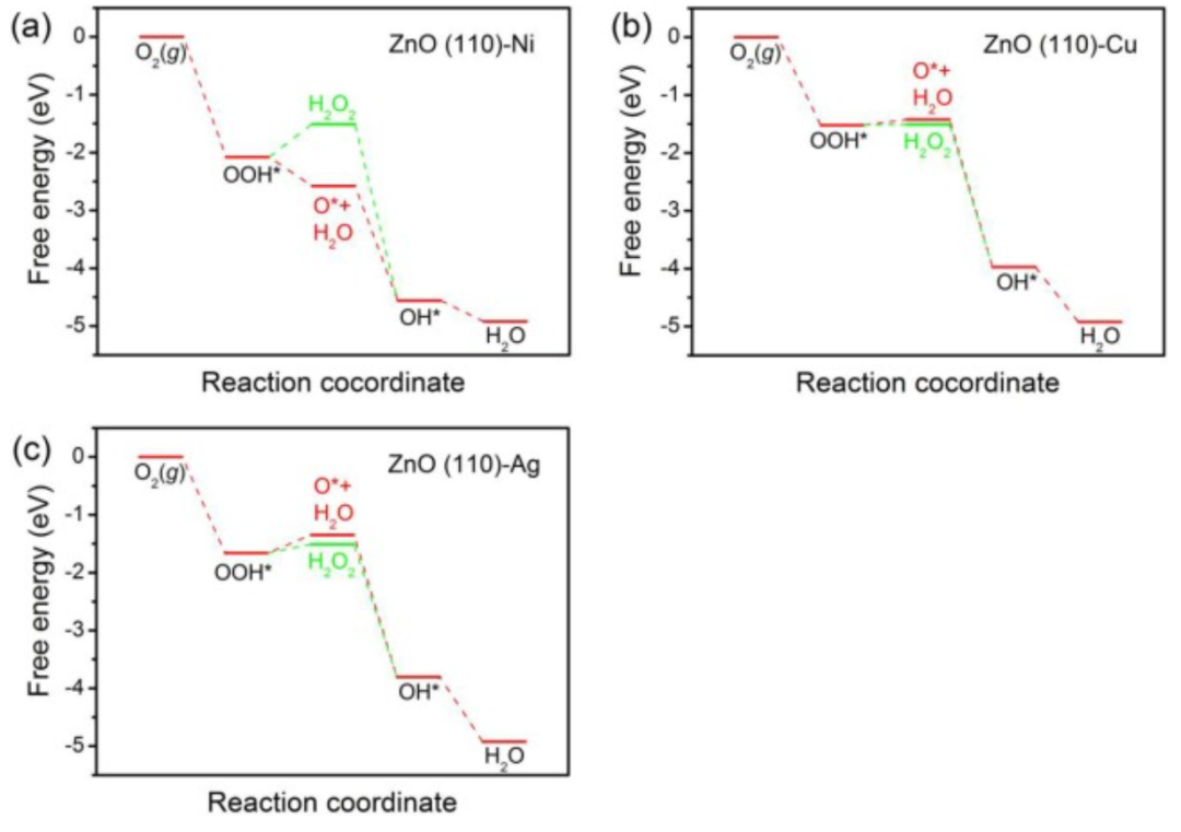 如图7所示,除了ZnO(110)表面外,H2O2的形成非常困难。在ZnO(110)表面上,由于OH*的弱吸附强度,使得OH*氧化生成H2O2的自由能与生成O*和H2O的自由能相当,表明H2O2和O2可以通过H2O的氧化同时生成。