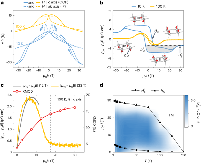 图5 | Ca3Co3O8中强大的拓扑霍尔效应。展示了在高达33T的磁场下Ca3Co3O8的磁阻和霍尔电导率,以及在100K下的THE和磁化强度随磁场的变化。