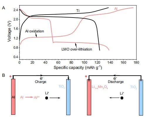 在腐蚀过程中,集流体提供了额外的不可逆过充电能力。考虑到电池的电荷平衡,阴极侧的铝氧化对应于阳极侧的还原,从而平衡了氧化还原反应。因此,在这种氧化还原反应中,阳极的预锂化补偿了阴极侧额外的电子损失。为了验证通过铝氧化延长寿命的机制,作者评估了单独使用Al和使用Ti作为集流体的全电池LMO||10 M LiTFSI ||TiO(图3)性能。在0.79 cm2的LiMn2O4电极后面附加一个额外的2 cm2的裸铝箔,通过氧化铝作为预锂添加剂来放大电子补充。从图3中可以看出,与Ti集流体相比,带有铝集流体的电池在第一次充电过程中表现出了约1.2-1.3V的额外平台期,这归因于铝集流体的腐蚀。此外,在接下来的放电过程中,大约1V的额外平台属于LiMn2O4的过锂化。