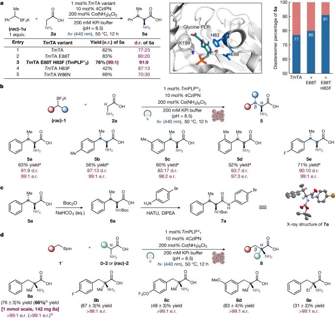 研究者假设,如果另一个不同的α-功能化PLP酶家族,包括苏氨酸醛缩酶、丝氨酸羟甲基转移酶、苏氨酸转醛缩酶(TTAs)及其相关的生物合成酶,可以被重新利用并进化为sp3–sp3氧化偶联,这将使研究者能够推进一种前所未有的吡啶醛自由基生物催化模式,用于立体选择性和无保护基团的ncAAs合成。包括那些带有连续立体中心和α-四取代立体中心的,这些仍然是催化不对称合成所不能达到的(图1b)。