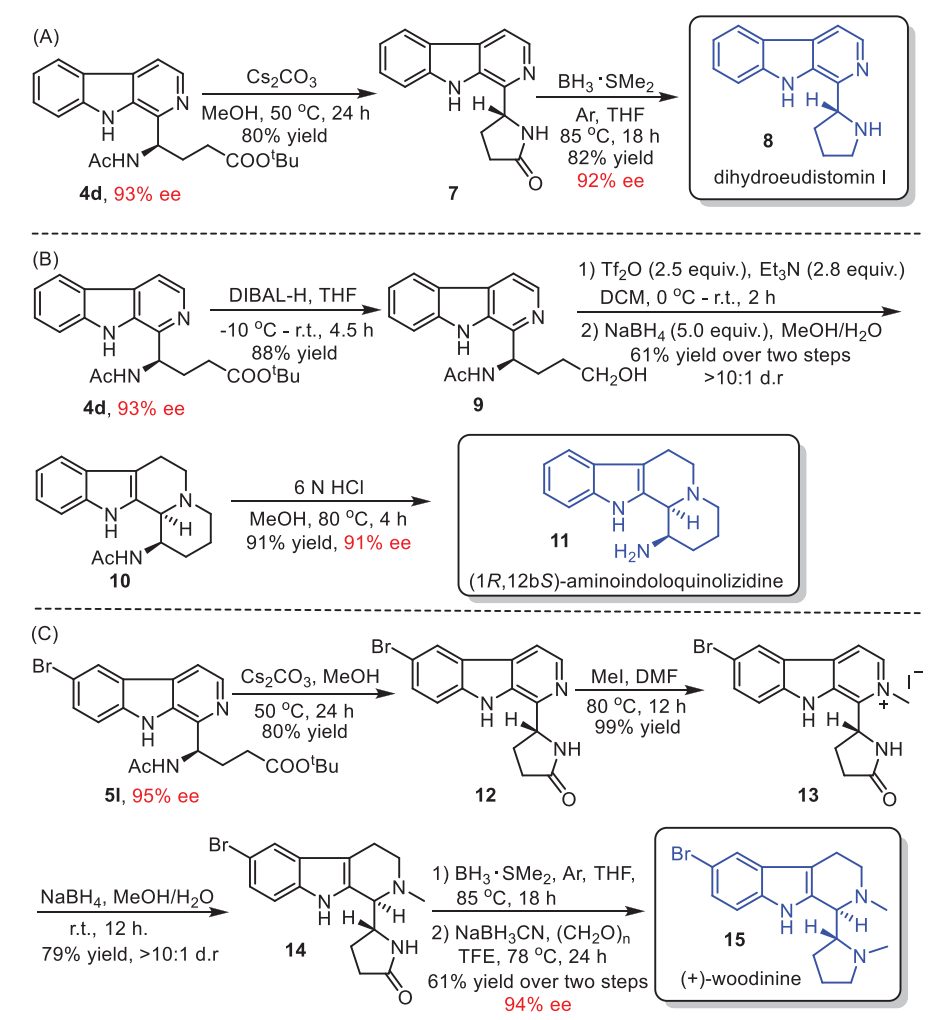 该方法具有反应条件温和,步骤经济,高化学/对映选择性控制以及良好的官能团耐受性等优点。研究表明,重氮化合物是该对映选择性串联自由基反应中合适的自由基前体。此外,该方法被成功用于活性天然产物和药物中间体的合成中,进一步证明了该方法的有效性和实用性。