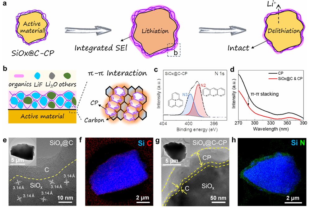 图2:通过在SiOx颗粒上复合内部石墨化碳层和外部共轭导电聚合物(CP)层来构建re-ad-SEI的策略。