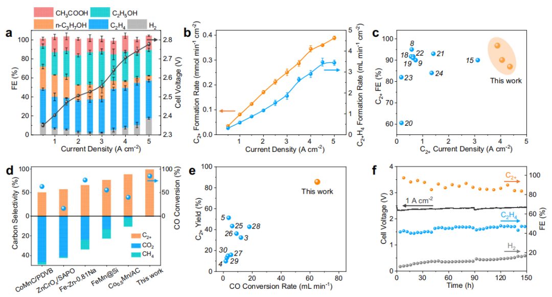 实验结果显示,在低电池电压2.78 ± 0.01 V下,实现了高达4.35 ± 0.07 A cm-2的C2+局部电流密度,C2+法拉第效率为87%±1%,CO转化率为85 ± 3%。