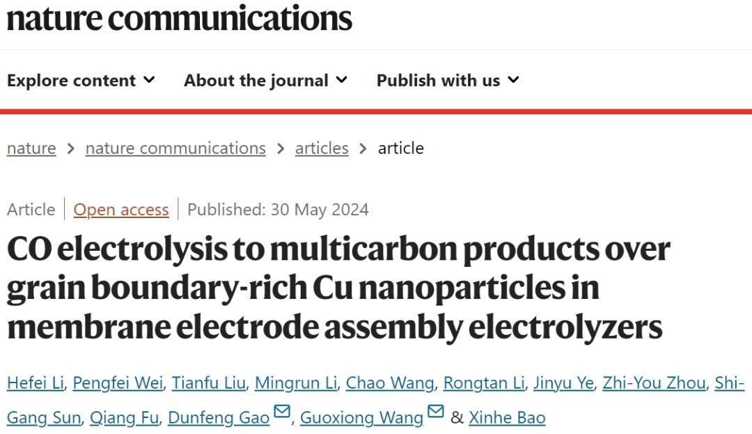 标题:CO electrolysis to multicarbon products over grain boundary-rich Cu nanoparticles in membrane electrode assembly electrolyzers