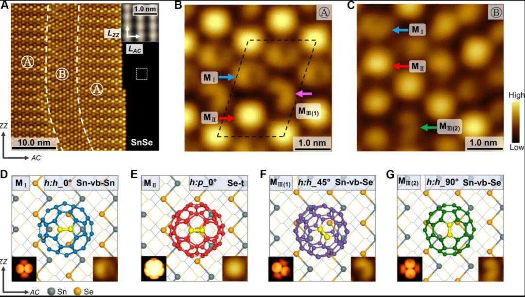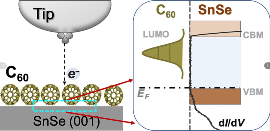 这一策略的关键在于利用C60分子的最低未占分子轨道(LUMO)部分低于半导体的导带最低点(CBM),进而通过这种类型II带对齐来实现更好的解耦。实验结果显示,在C60分子吸附于SnSe(001)表面后,STM测量揭示了由振动激发引起的特征,成功检测到了Hg(ω1)振动态的存在。这一发现不仅为理解振动耦合现象提供了新视角,也为电子和能量收集系统的设计提供了重要参考。