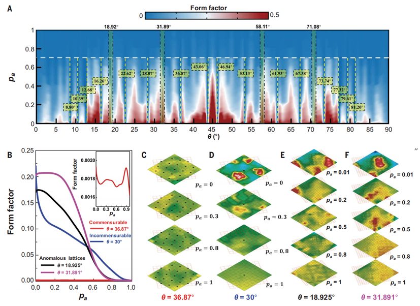当扭转角度分别导致流体摩尔超晶格中的毕达哥拉斯角和非毕达哥拉斯角时,作者观察到能量的去局域化和局域化。即使在具有大晶格常数且满足毕达哥拉斯角的可公度摩尔流体中,也发现了异常局域化。