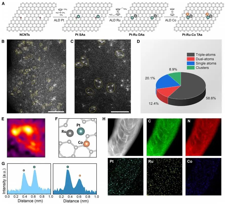 通过原子层沉积(ALD)技术,作者制备了Pt-Ru-Co TAs,以氮掺杂碳纳米管(NCNTs)作为支撑材料。以三甲基(甲基环戊二烯基)-铂(IV)(MeCpPtMe3)为Pt前驱体,双(乙基环戊二烯基)钌(II)和钴二烯(Co(Cp)2)分别作为Ru和Co的前驱体,O2为反应气,高纯N2为吹扫气和载气。在ALD过程的第一个循环中,Pt物种被定位在N位点附近,在NCNTs底物上形成原子分散的Pt SAs。然后,选择性地将Ru原子沉积在Pt SAs上,得到Pt-Ru DAs。最后,在形成的Pt-Ru DAs上沉积Co原子,得到Pt-Ru-Co TAs。