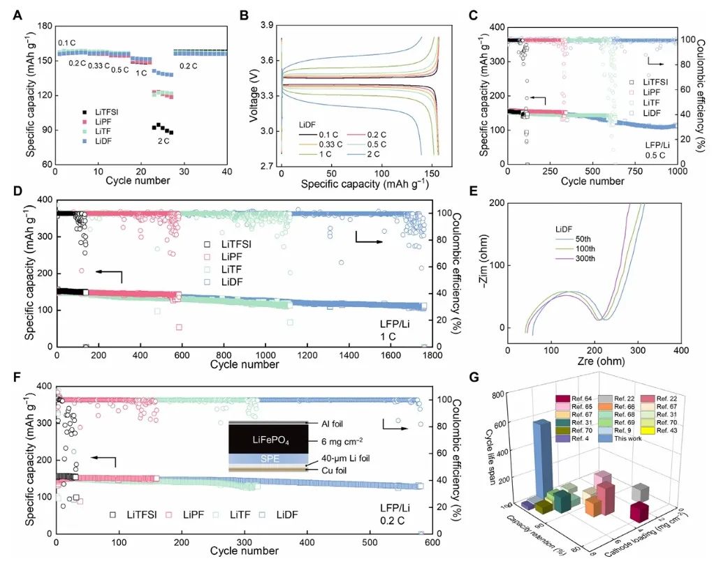 结果显示,使用最佳SFALS(即LiDF)的LiFePO₄/Li ASSLMBs展现出超过1650次循环的卓越长期稳定性,库仑效率为99.8%。使用高负载正极(6 mg cm⁻²)和薄Li箔(40 μm)的全电池实现了580次循环的记录寿命,容量保持率为97.4%。因此,SFALS为开发高性能全固态锂金属电池的功能性锂盐提供了一种方法。