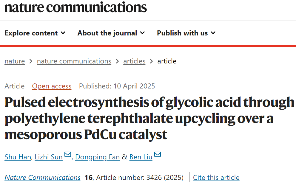 2025年4月10日,四川大学刘犇研究员、孙立智博士在国际顶级期刊Nature Communications上发表了题为《Pulsed electrosynthesis of glycolic acid through polyethylene terephthalate upcycling over a mesoporous PdCu catalyst》的研究论文。