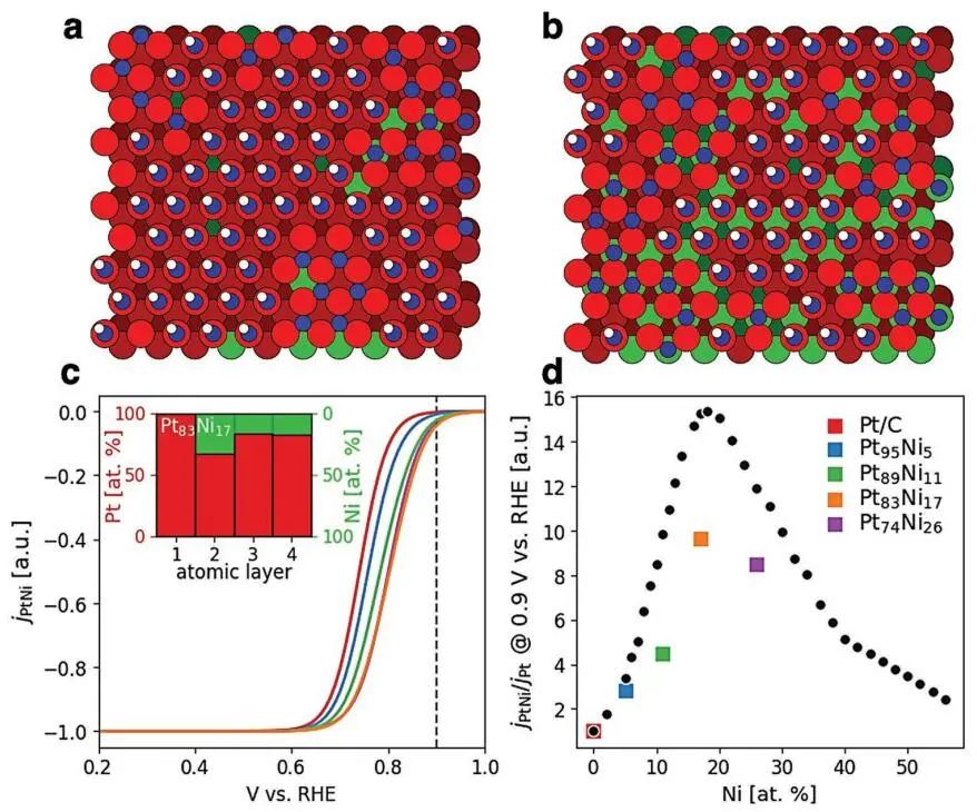 通过密度泛函理论(DFT)计算,作者计算了Pt(111)面上的*OH和*O结合能。在模型中,假设*OH吸附在顶部,而*O吸附发生在fcc和hcp中空位点。当*O被吸附在中空位置时,相邻的三个顶部和中空位置被阻塞,无法吸附。当*OH被吸附时,相邻的三个空穴无法到达。在*OH和*O结合能的预测中,考虑了最接近的原子组成。Ni原子距离最近的组合物较远,导致特定吸附位点的结合能范围接近正态分布,而不是离散值。总之,随着Ni含量的增加,*O的覆盖度增加。