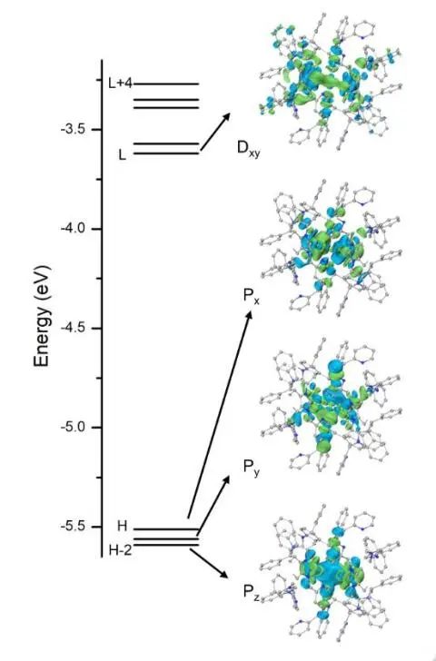 通过DFT计算,表明存在双重简并HOMO和HOMO-1能级。单简并HOMO-2能级也表现出ed P轨道特征。R-Au13-NHC中P轨道的分裂不同于[Au13(dppe)5Cl2]3+中Pz沿z轴穿过两个氯原子的双简并的Px和Py组的分裂。