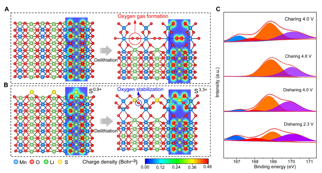 为了揭示表面成分的演变,作者进行了高分辨率能量色散谱(EDS)测试。如图2E所示,Mn、Co、Ni、O和S的EDS图谱显示了S元素在纳米尺寸晶体本体区域中的均匀分布。根据XRD、TEM/STEM、XPS和XAS结果,可以令人信服地得出结论: SO32−键合在S-LRMO的表面,未反应的无定形Li2SO4位于SO32−的外层。