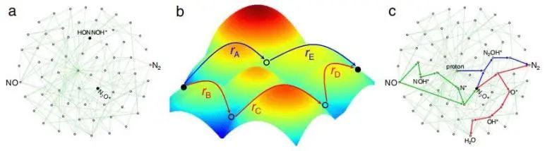 根据相图和理论计算,研究人员发现eNORR的低N2选择性来源于两个方面:一方面,从能量角度来看,所有过渡金属催化剂的表面反应性对N2的生成都是非常不利的。首先,过渡金属表面始终与N2OH*结合过弱,抑制了N2O*质子化;其次,O*和OH*之间的标度关系使得强反应过渡金属表面上的活性中心受到O*/OH*的毒害,或者使得N2O*在弱吸附的金属表面上很难解离。因此,这两种性质协同作用使所有过渡金属具有高的N2O选择性。