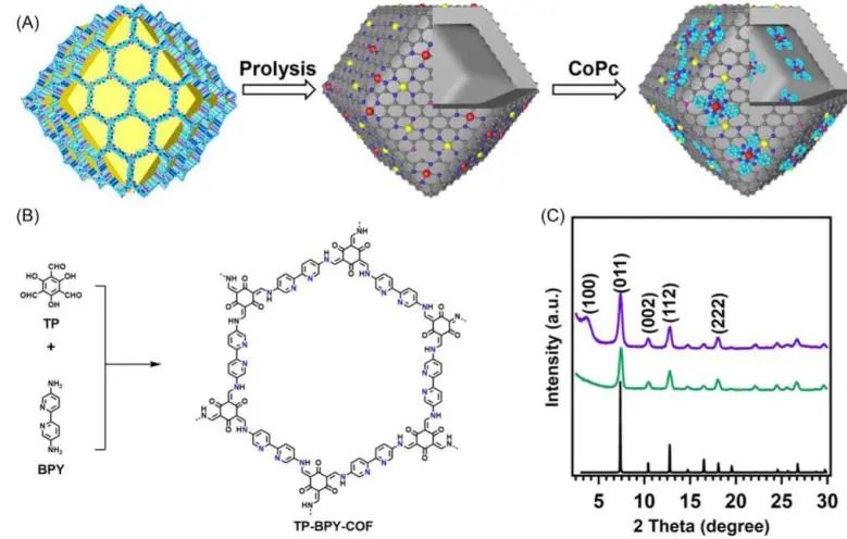 结果表明,外层COF阻止了MOF核的聚集,减少了热解过程中锌离子和氮、氧原子的损失,促进了高锌活性中心和杂原子的形成,防止了热处理后COF的坍塌。通过配位作用固定酞菁钴(CoPc)分子,得到的中空催化剂碳壁上含有丰富的N和O原子(N占10.73%,O占8.31%),并且钴和锌的含量分别为2.47wt.%和11.05wt.%。