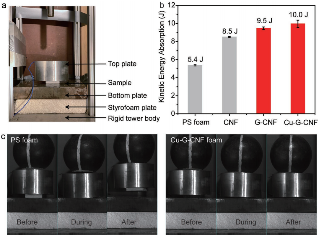 图3:PS泡沫、CNF泡沫、G-CNF泡沫和Cu-G-CNF泡沫的动能吸收;(a)包括框架在内的多个组件的照片;(b)PS泡沫、CNF泡沫、G-CNF泡沫和Cu-G-CNF泡沫的动能吸收;(c)测试期间高速相机拍摄的照片。