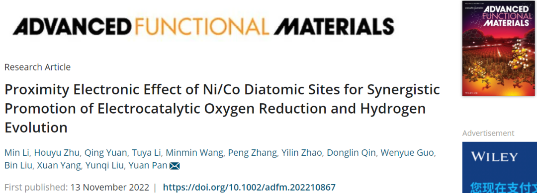 Proximity Electronic Effect of Ni/Co Diatomic Sites for Synergistic Promotion of Electrocatalytic Oxygen Reduction and Hydrogen Evolution. Adv. Funct. Mater., 2022, DOI: 10.1002/adfm.202210867.