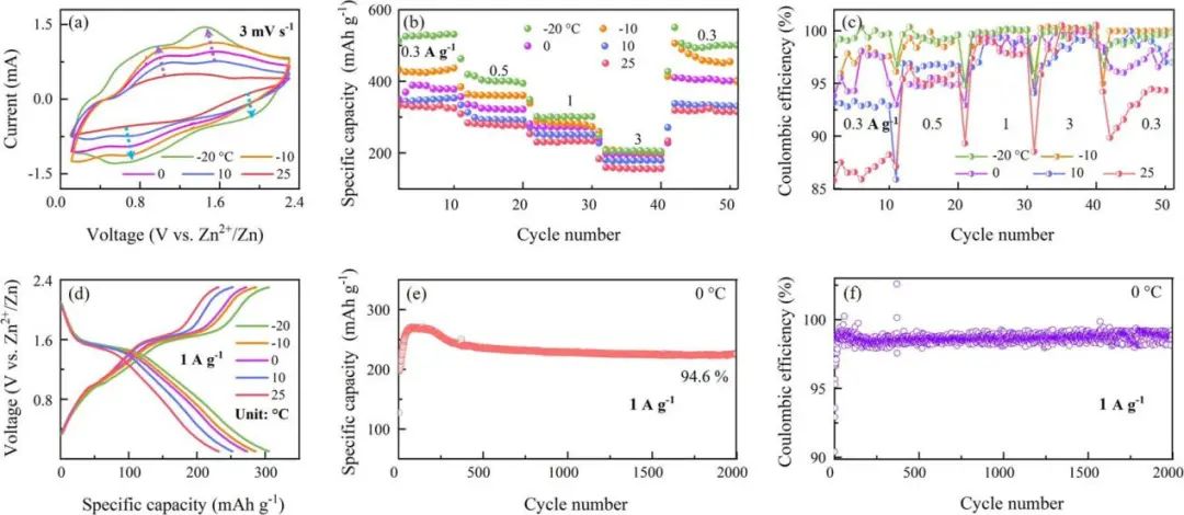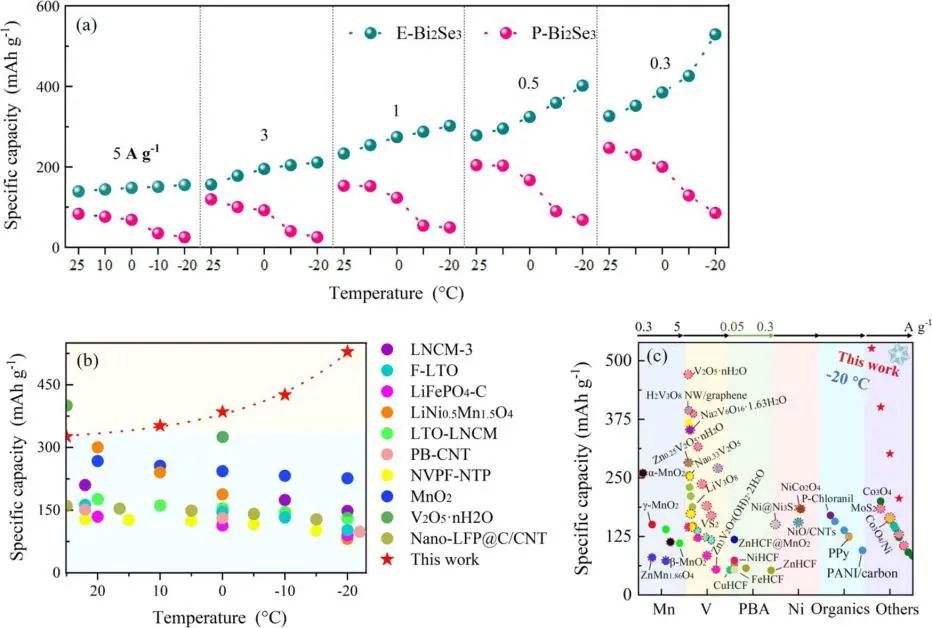 令人惊讶的是,Zn||E-Bi2Se3电池表现出异常的低温性能(-20 °C、0.3 A g-1时的容量高达524 mAh g-1),甚至优于其在25 °C时的性能(在0.3 A g-1时的容量为327 mAh g-1)和所有先前报道的低温电池的测量值。