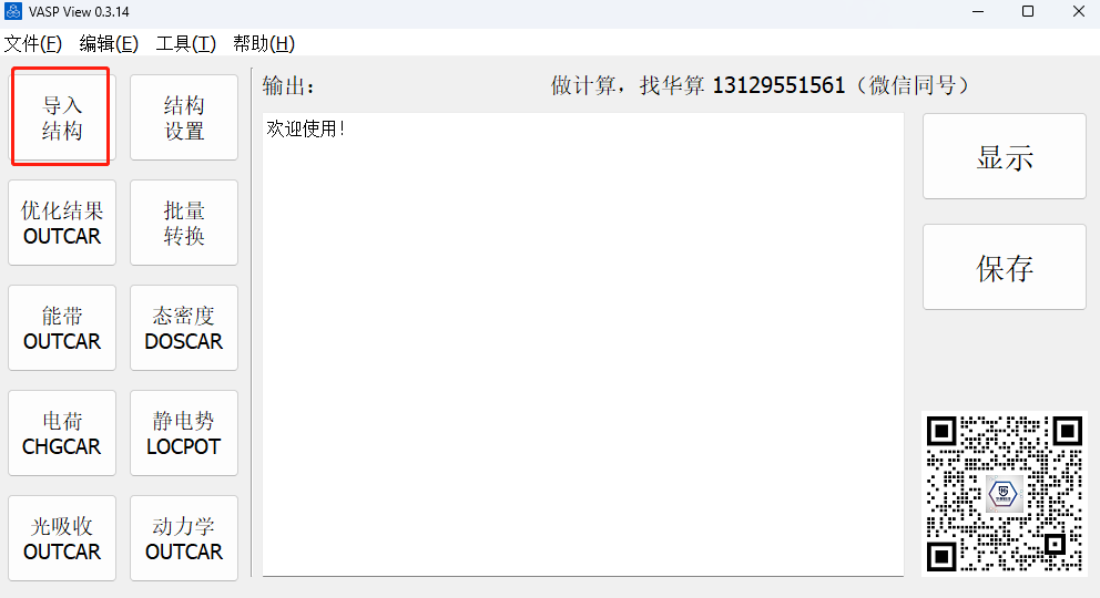 结构导入模块能够加载具有cif、xsd、POSCAR等格式的文件。点开导入结构按钮,可选择所需要加载的结构文件,并在主面板中看到结构信息,包括晶格常数、夹角、晶胞基矢、原子坐标。加载结构后,点击显示按钮,可获得结构模型的3D图。最后,点击保存按钮可导出为POSCAR或者CIF等格式文件。
